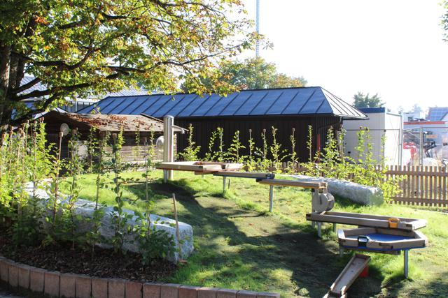 Unser Garten mit alten Bäumen ist abwechslungsreich mit Sandkästen, Rutschen, einer Wasserstelle und vielen Spielgeräten gestaltet. Er bietet vielerlei Möglichkeiten für Rollen- und Bewegungsspiele. Die Kinder können sich hier auch bei Wind und Wetter nach Herzenslust austoben.