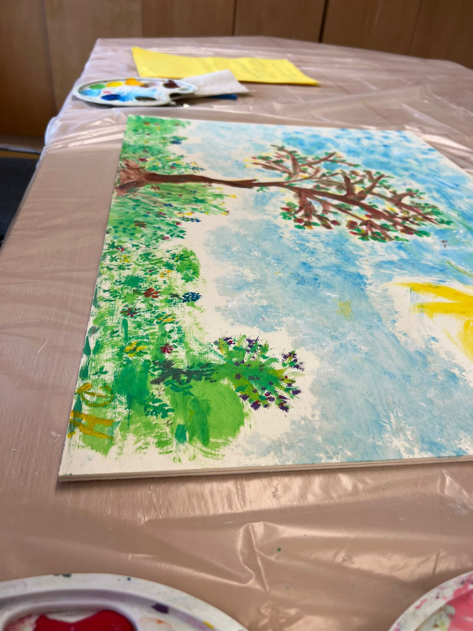 Zu Beginn führte eine Imaginationsreise genau dort hin- in den eigenen Garten an einem Nachmittag im Sommer, in den Urlaub in der Ukraine, in das Heimatdorf, vor den Sauerbraten an einem gedeckten Tisch…Anschließend nahmen diese Momente farbenfroh mit Gouachefarbe Gestalt an.